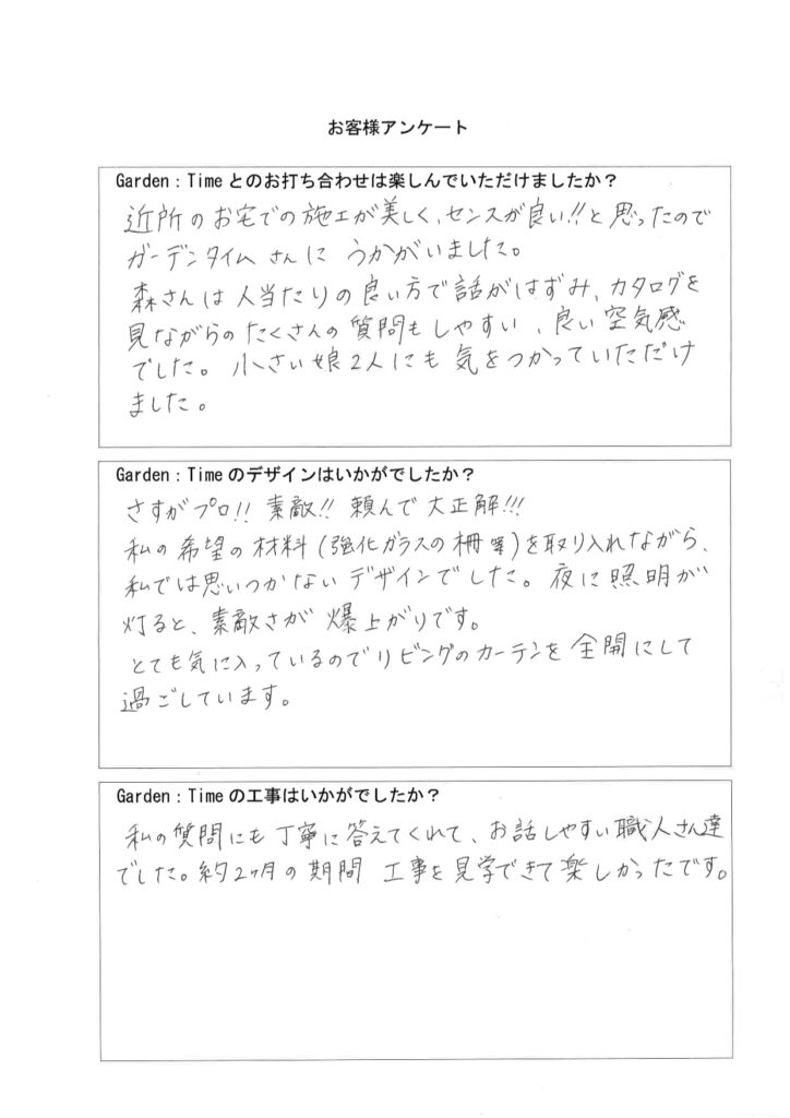 「Garden:Timeとのお打ち合わせは楽しんでいただけましたか?」はい、とても楽しかったです。森さんのご提案デザインを見るのがとても楽しかったですし、私たちの要望・悩みに対してよく考えてご提案いただいて、納得した上で最高に良いお庭を作り上げられて、最初に相談させていただいてから1年半、有意義な時間でした。ありがとう...