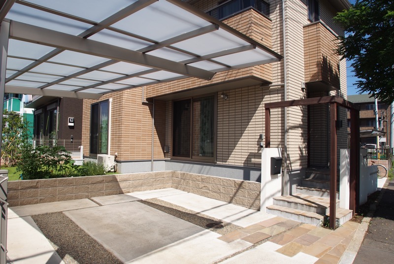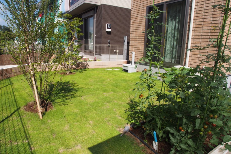 駐車場奥にあるお庭は一面天然芝のアウトドアスペースです。青空がとっても似合うナチュラルモダンなエクステリアになりました。