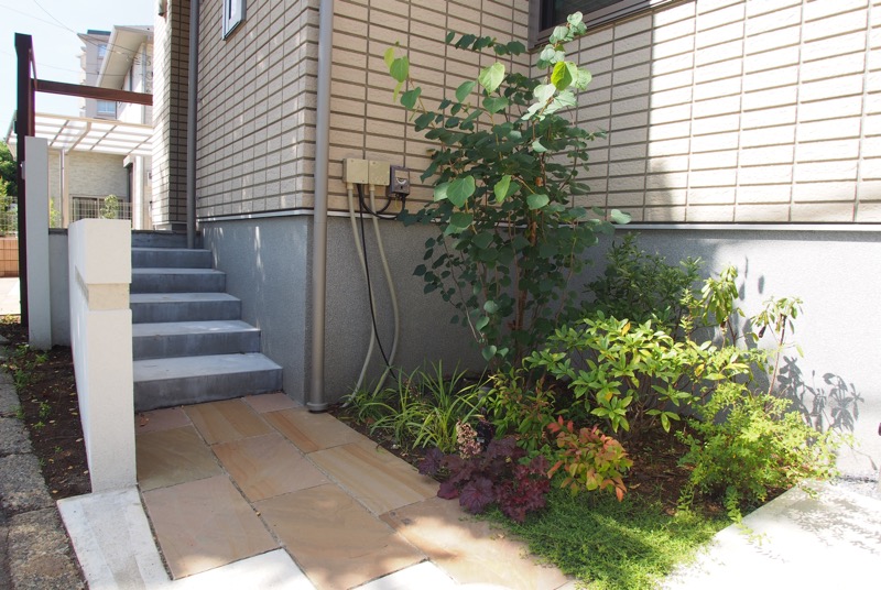 床面は家の外壁と同系色の自然石を使って全体的な一体感を出してみました。