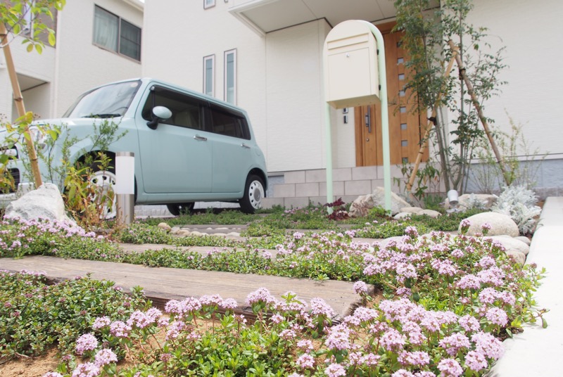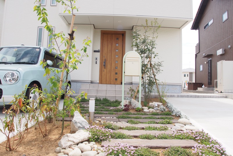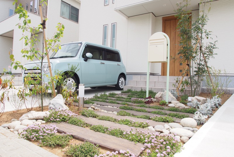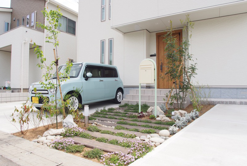 既設だった擬木枕木に自然景石と植栽を配置した中央のアプローチ。自然味ある素材を部分的に置くことよってシンプルなデザインの中にフォーカルポイントが定まり注目度がアップします。お車とカラーリングを合わせた独立型ポストも可愛らしく決まりました。
