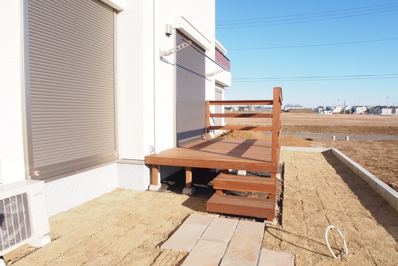 主庭はウッドデッキと天然芝でナチュラルテイストに仕上げています。お天気の日は眺めの良いウッドデッキの上でゆっくりとした時間を過ごして頂きたいです。