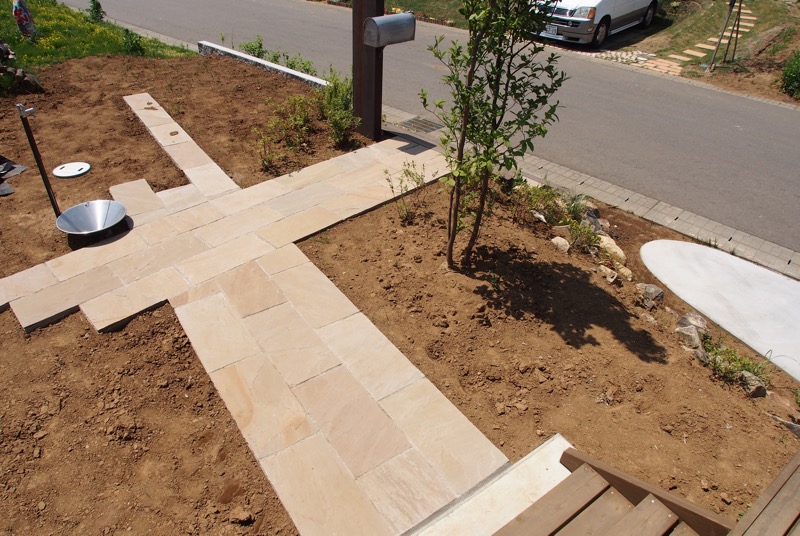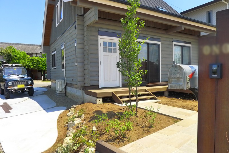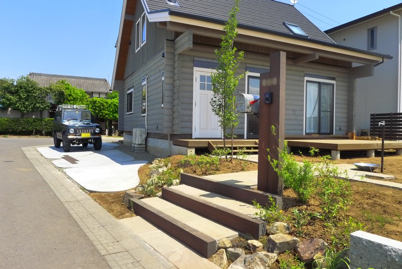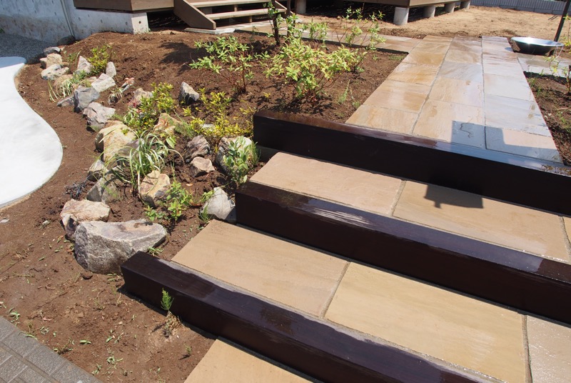 エントランスはウリン材で機能門柱とステップを造作し、アプローチは長方形の自然石が。アプローチのステップの両端には自然石をランダムに配置し土留の役割を果たしています。