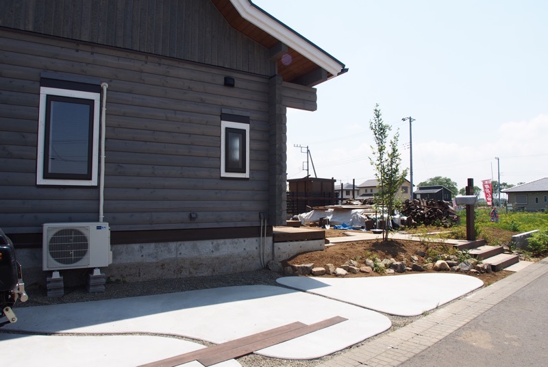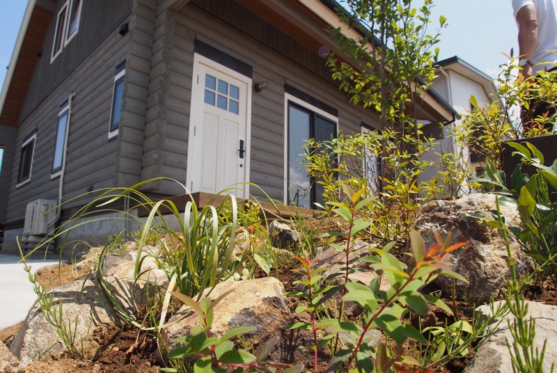 アウトドアという言葉が似合うログハウス調のご新築にピッタリな、石と木を使ったオープンファサードをデザインしました。