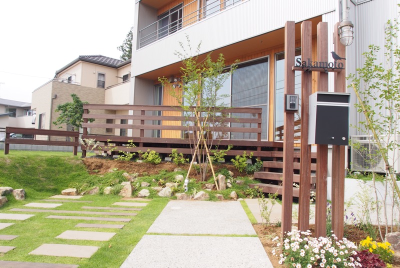 木目の外壁がとても印象的なご新築。家の外観から逆算して、天然木のウリンや芝生をふんだんに使った緑豊かなアウトドアガーデンをデザインしました。