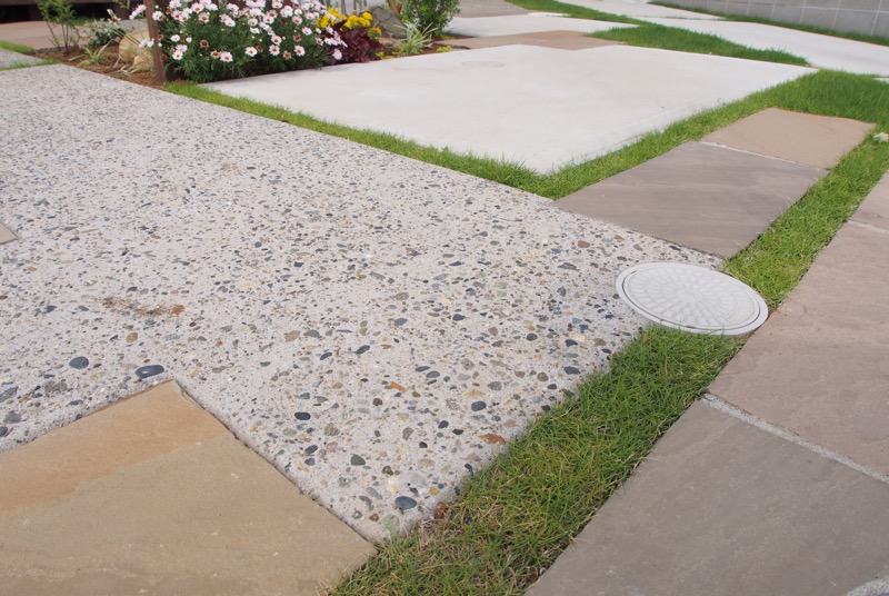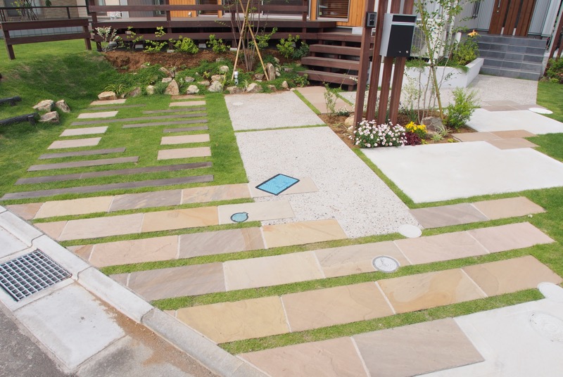 ファサードとメインガーデンの境は明確に付けないことで、緑がお庭いっぱいに広がっているようですね。ファサードには天然石、枕木、下草など、ナチュラルマテリアルがいっぱい。お子様はもちろん、植栽好きの奥様にとっても楽しい空間ですね。