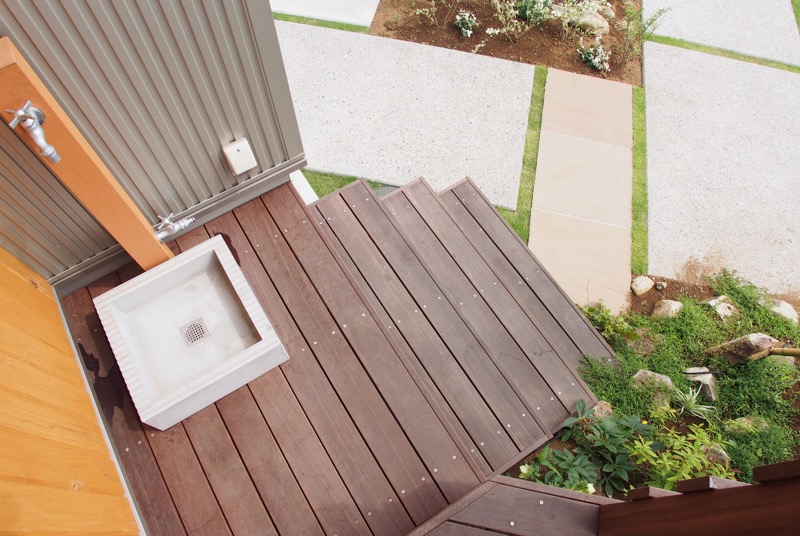 ウッドデッキはあえて三角状に造作することで特別感と愛着が感じられるようにデザインしました。
