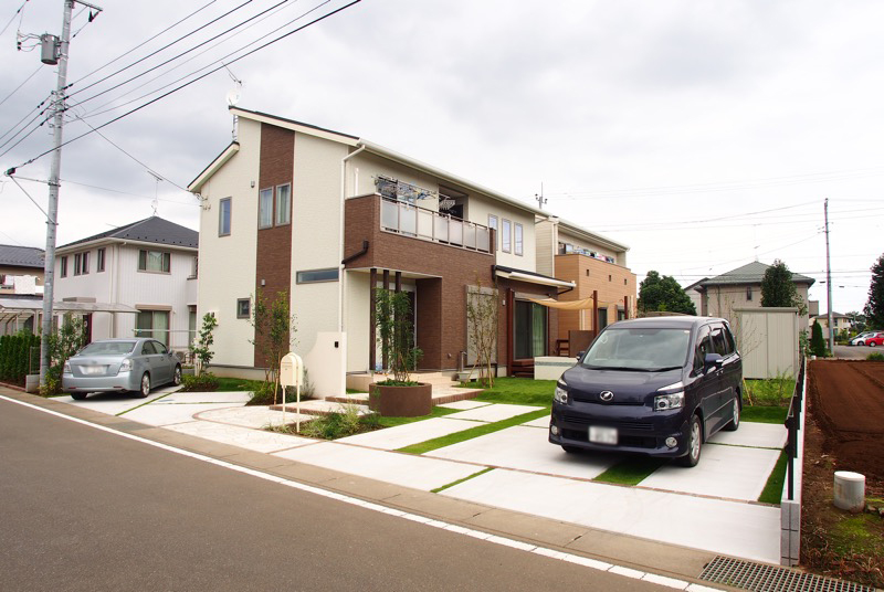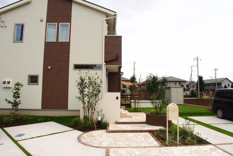 圧迫感を感じる構造物を極力なくしたオープンタイプのエクステリアは、乱形石や様々な植栽、天然芝に彩られたナチュラルな空間。色調は白や茶などやわらかみのあるカラーリングで、穏やかな雰囲気をまとっています。