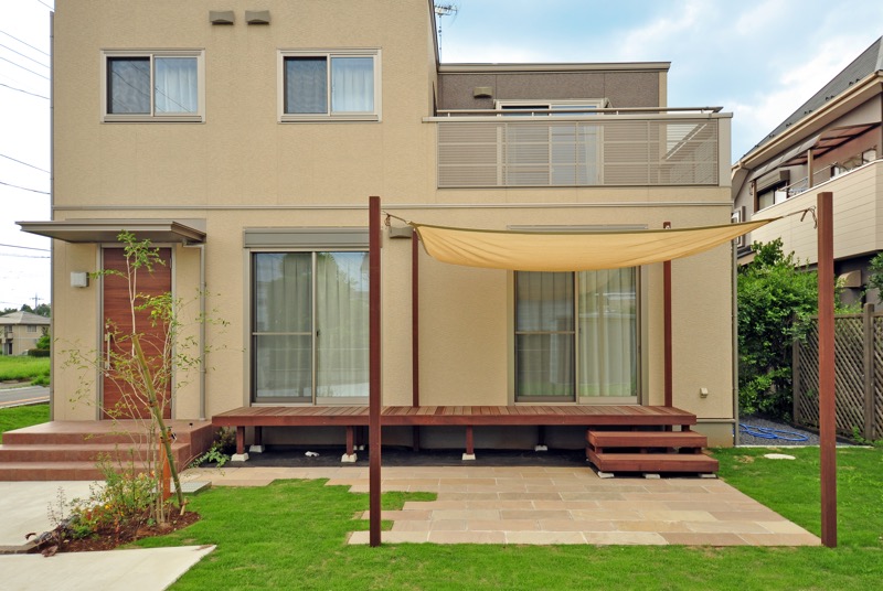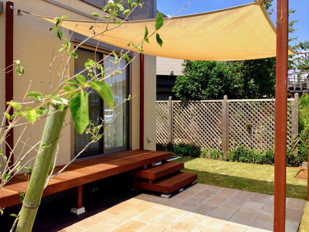 タープとウッドデッキで広々としたメインガーデンをナチュラルに演出しました。