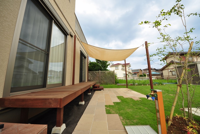 タープのお陰で強い日差しがリビングルームの中に差し込まず、お庭の外もでも中でも涼しく過ごせるように考えてあります。ウッドデッキを降りると自然石で組まれた石畳があるので、雨上がりでもぬかるみとは無縁でお庭を楽しんでいただけます。