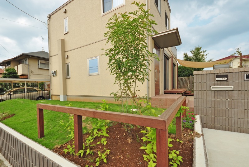 元々出来上がっていたアプローチにも木柵をアクセントで取り入れて間延びしていた空間を引き締めます。