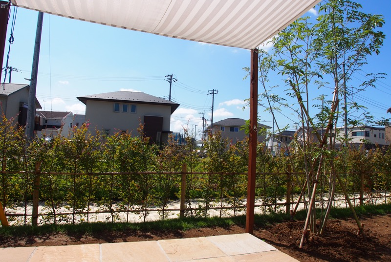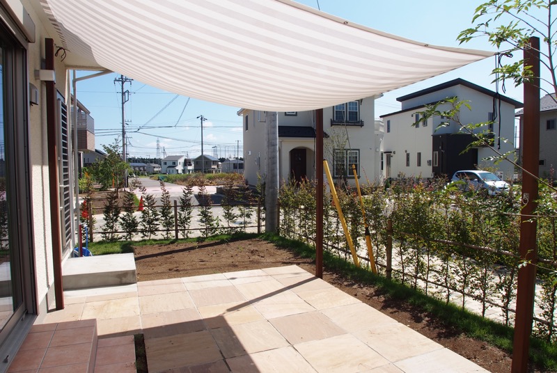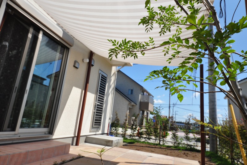 お庭をゆったりとした気分で過ごすため、爽やかなイメージのタープを取り付けました。家の外壁に部品を打ち込むと安全性や気密性に影響を及ぼす可能性があるため、ウリンの柱を家の壁に沿うように取り付けて、タープをセットしました。強い日差しもこのタープがあればしっかりとカットしてくれるため、お庭での過ごし方は勿論リビングルームでの生活環境も改善されました。
