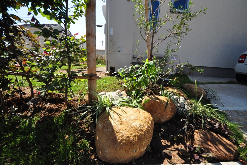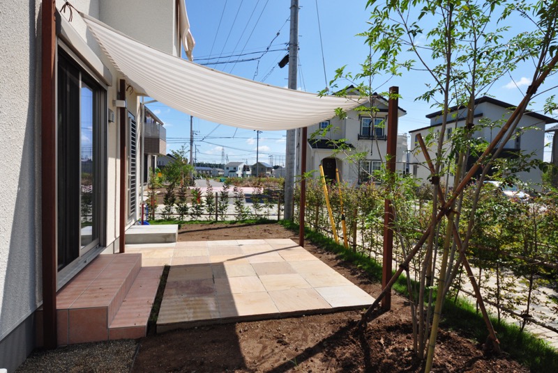 美しいタープと自然石によって、エクステリアがより美しい空間へと進化しました。