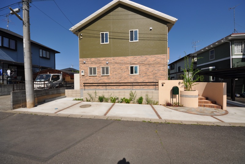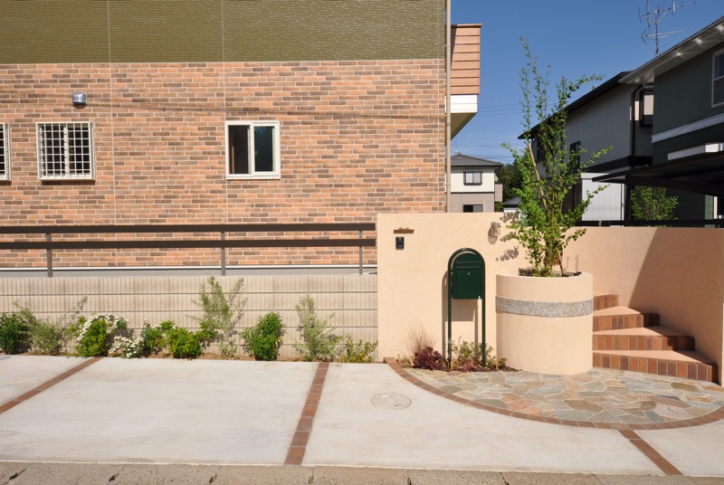 高低差のある門まわりを、シンボルツリーを中心としたデザインで可愛らしく演出しました。円柱状に作ったシンボルツリー用の植栽スペースを取り巻くように、暖色系のデザインウォールを造作しています。