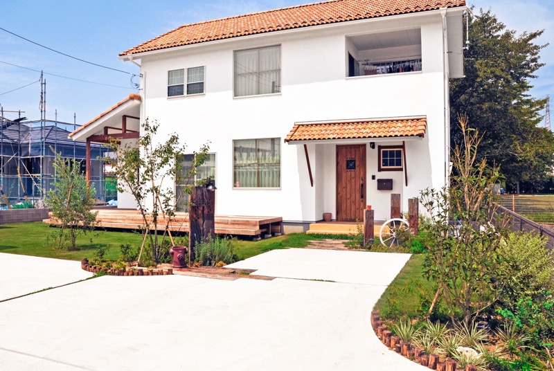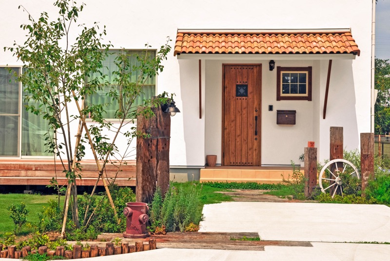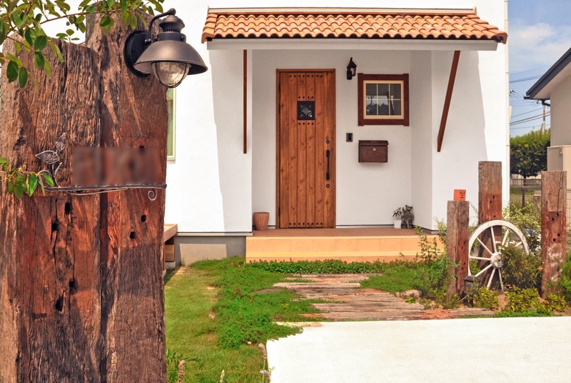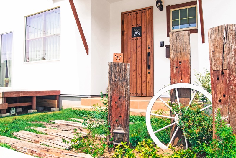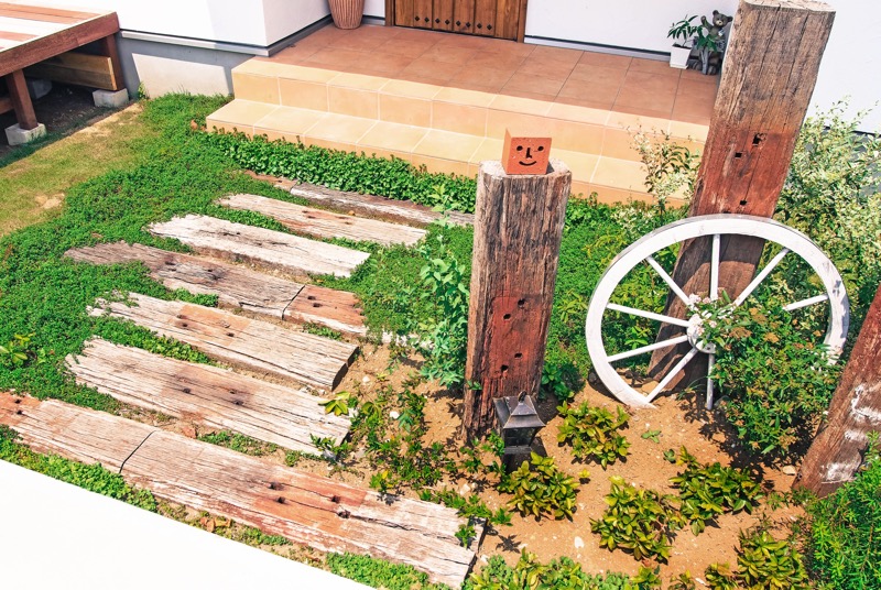 オレンジ色の鮮やかなレンガが眩しいご新築にピッタリの、レトロなオープンエクステリアをご提案しました。リサイクルした古い枕木を門柱としてエントランスに立て、表札や門灯を設置。下草やアンティークなアイテムに囲まれた門柱は、エクステリアのフォーカルポイントとして施主様一番のお気に入りのデザインになりました。