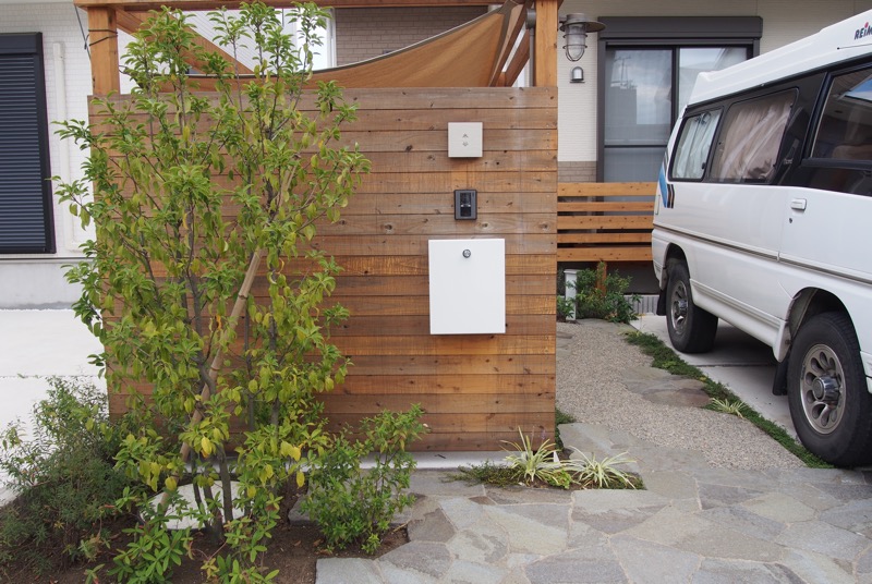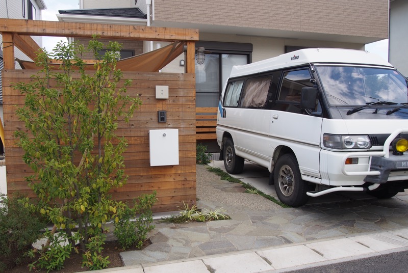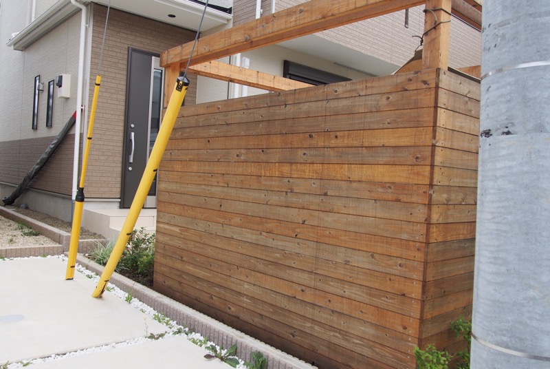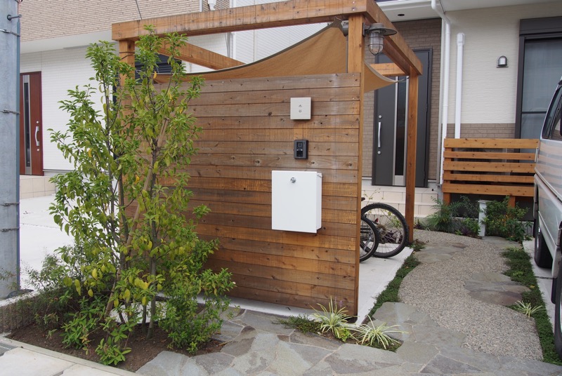 全て天然木で造作したサイクルポートは側面を板塀状にし、門袖壁としても使用できます。屋根部分はタープを貼り、雨風から自転車を守ります。