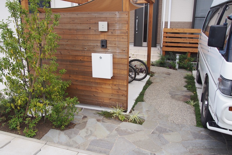 門まわりは植栽や乱形石で彩り、ナチュラルモダンなデザインに。見ても実際に使っても楽しい、秘密基地のようなファサードの完成です。