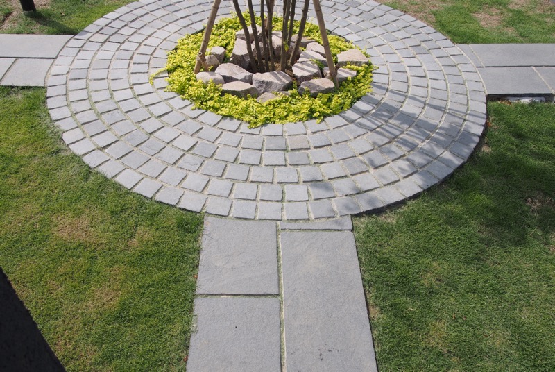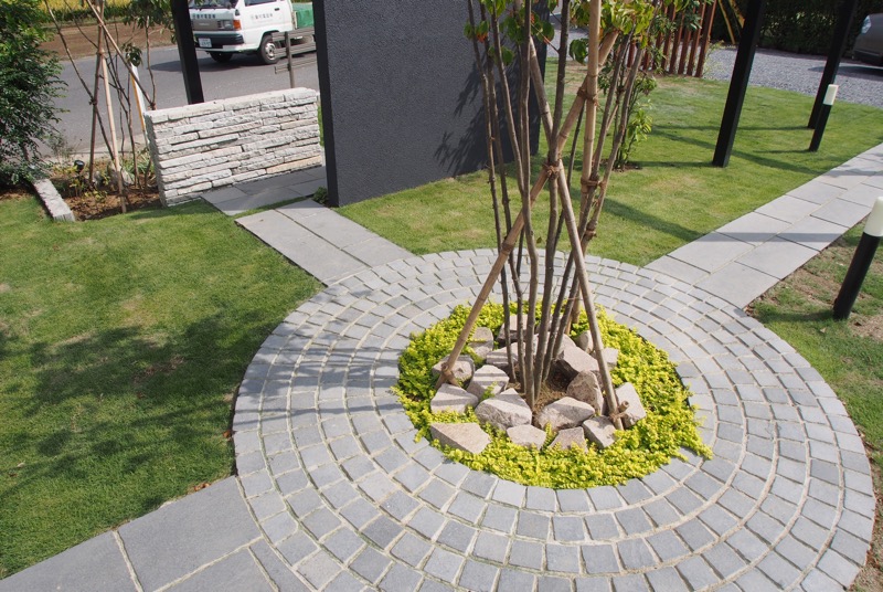 2つのアプローチが重なる先には、自然石で縁取られたシンボルツリーの植栽スペースが位置しています。お庭のどの角度から見ても見える高木は、まさにシンボルツリーにふさわしいフォルムです。