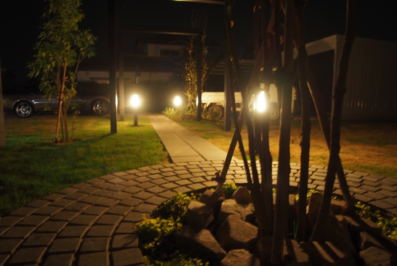 駐車スペース側のアプローチは夜も安心して行き来が出来るよう、ポールライトを等間隔に設置しています。ライトに照らされたゲートが、日中とは違った魅力を感じさせてくれますね。