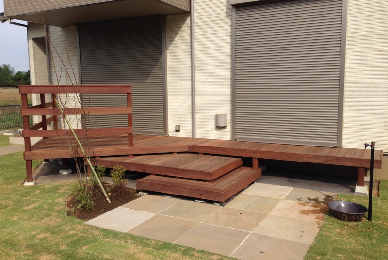 緩やかなアール状のアプローチを進むと、右手に変形したウッドデッキが見えてきます。三角形と四角形が融合したデザインのウッドデッキは通常の長方形のデザインよりも広く感じ、費用対効果は抜群です。ウリン製なので劣化にも強く、ランニングコストも◎。