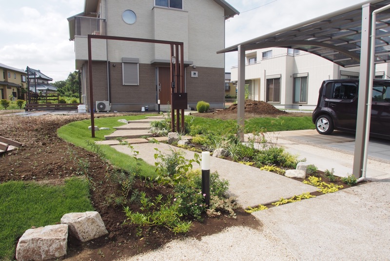 高低差のあるアプローチ脇の法面は芝を貼っていますので、雨の際も土がアプローチに流れ出るのを防いでくれます。