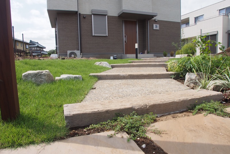 アプローチの途中には擬木を等間隔に取り入れ、高さの低い階段を作りました。段差が低いのでストレス無く勾配を登れるのはいいですね。