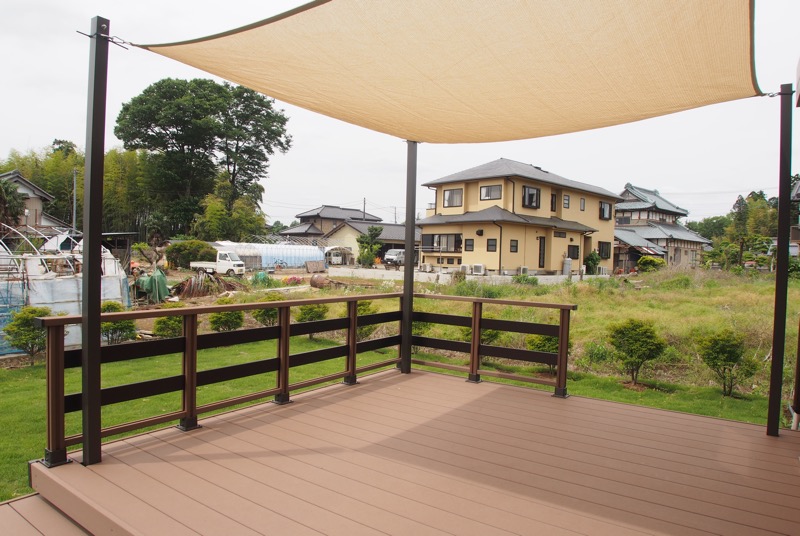 主庭のウッドデッキにはタープを取り付けてあるので、日差しの強い日もリラックスしてお庭が楽しめます。