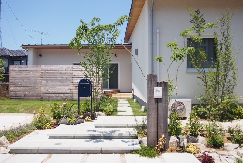 アプローチは方形の自然石を用い、カチッとした雰囲気にしてあります。差し色として選択したブルーのポストが素敵ですね。