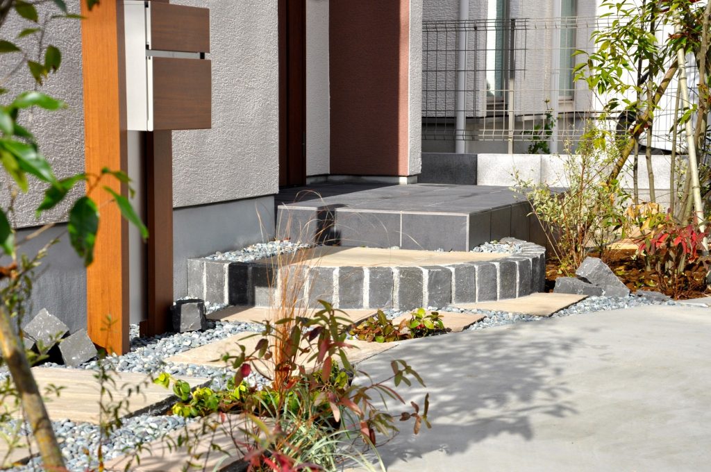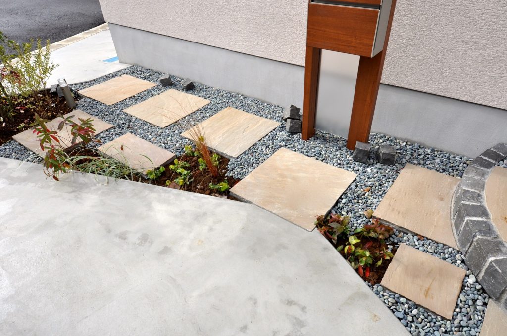 メンテナンス性も考えて砂利敷き部分も取り入れましたが、ピンコロ石を無造作に転がして、遊びとリズム感をアプローチに出しています。
