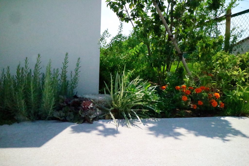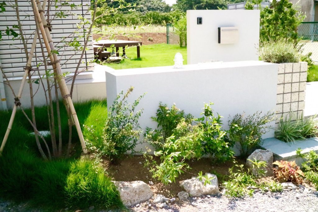 外壁は白いタイル、窓枠サッシはシルバー、バルコニーの腰壁もクリアパネルで、差し色と言うのは玄関ドアと玄関ポーチだけのシンプルコーディネートの建物でしたので、エクステリアのカラーコーディネートもそのコンセプトを壊さないように考えました。