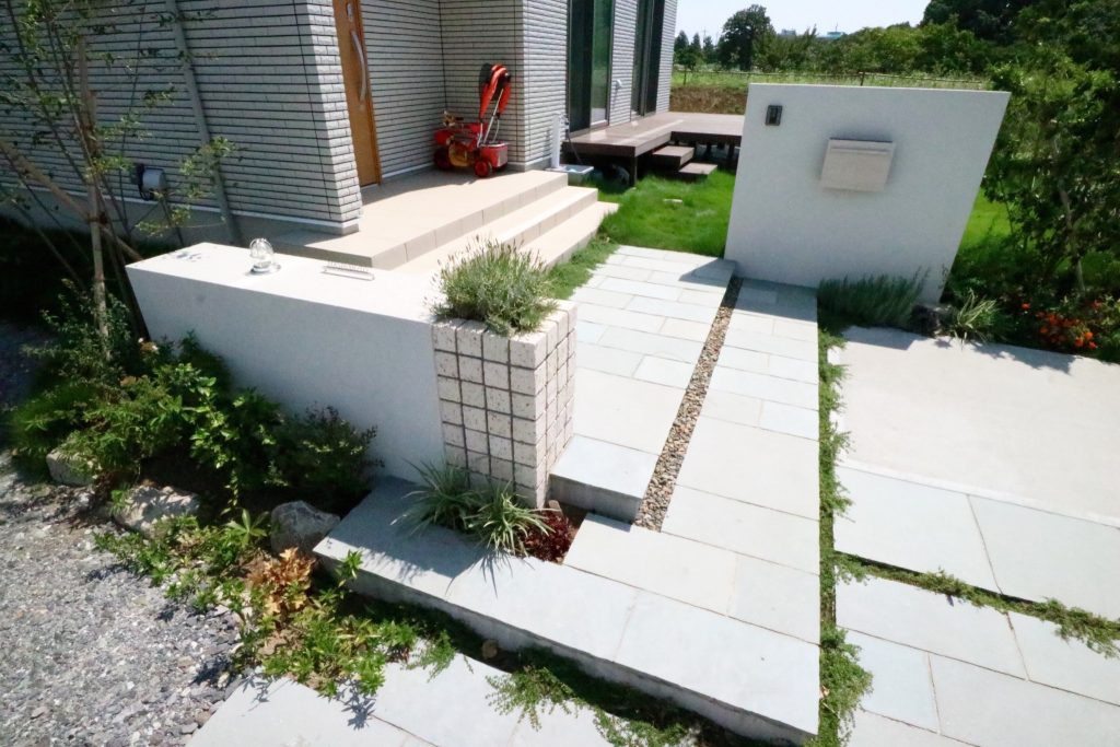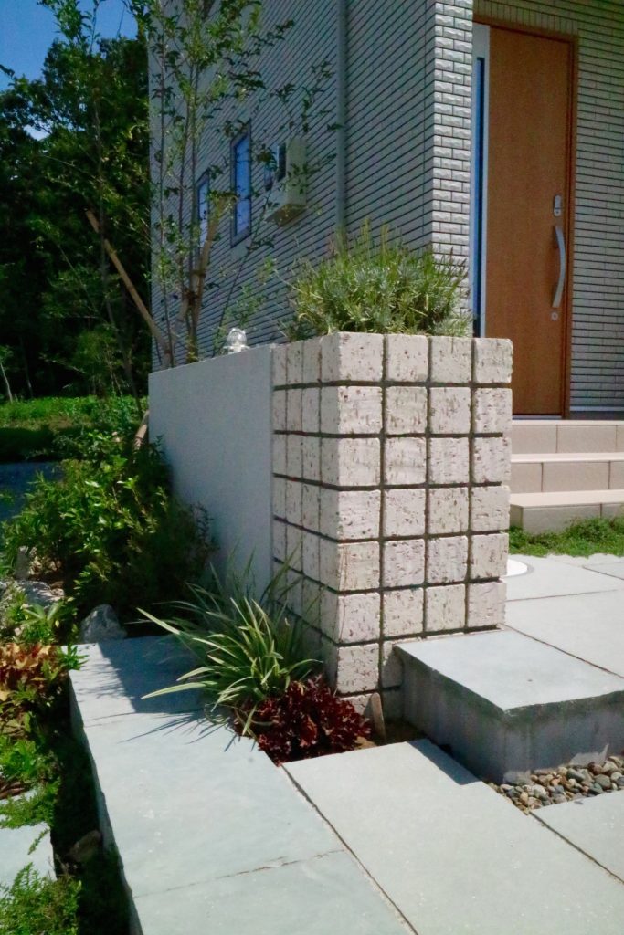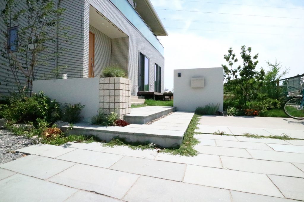 玄関ポーチがベージュ色でしたのでアプローチの敷石をブラウン系でまとめる事が無難だったのですが、青い敷石をご提案の一つとしてお話をさせていただき、奥様に「やってみましょう!」と快諾いただけました。
