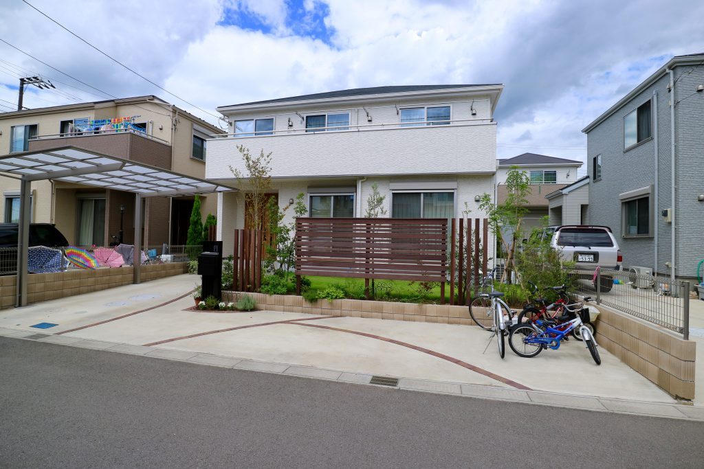 本当はアプローチも一緒に作り直したいと言う事でしたが、先ずは必要な機能を手に入れていただく事を優先して考えて、カーポートの屋根と目隠しフェンスを設置、さらに植栽の配置換えと植え替えを行いました。