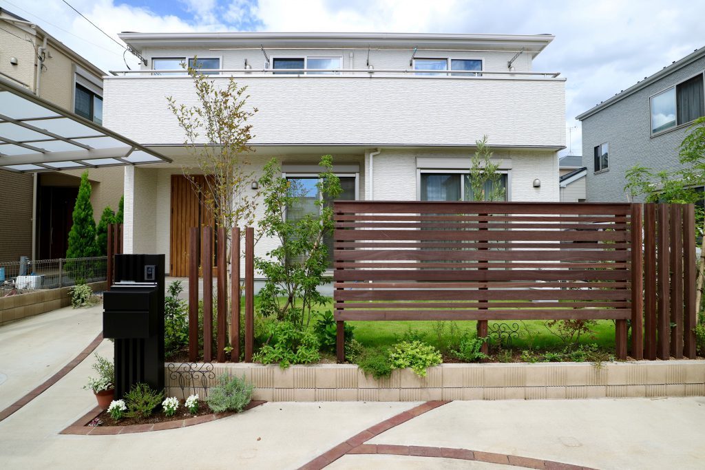 植栽も全体的に一昔前の建売住宅に使っていたような種類だったり、数は沢山あるのですが一つ一つのボリュームが貧相だったりしたので、アイアンウッドのウッドフェンスに絡めて新しく2本を入れ替えました。同時に全体の配置換えも行って植栽のバランスを良くしました。