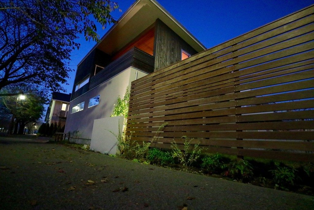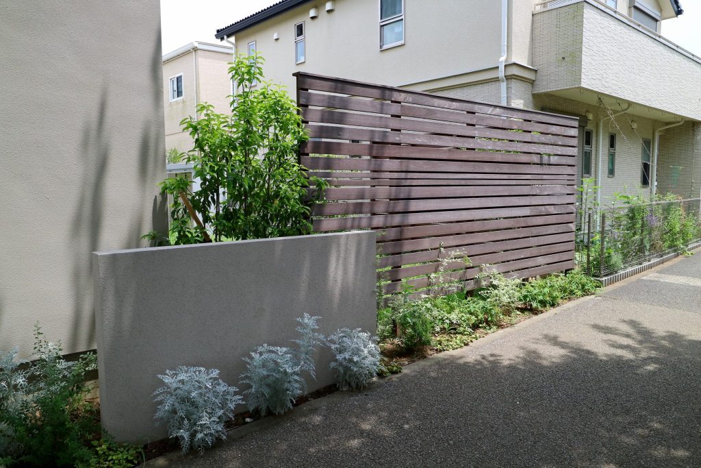 歩道側にも全体の繋がりを考えたデザインとして木柵と壁を設置して、お庭を囲むウッドフェンスはシンプルにボーダーフェンスとしました。これは実は歩行者の目線の高さになる部分に内側から板を貼り、ルーバーの目隠しになるように作ってあります。見えそうで見えないいい感じの目隠しフェンスになりました。