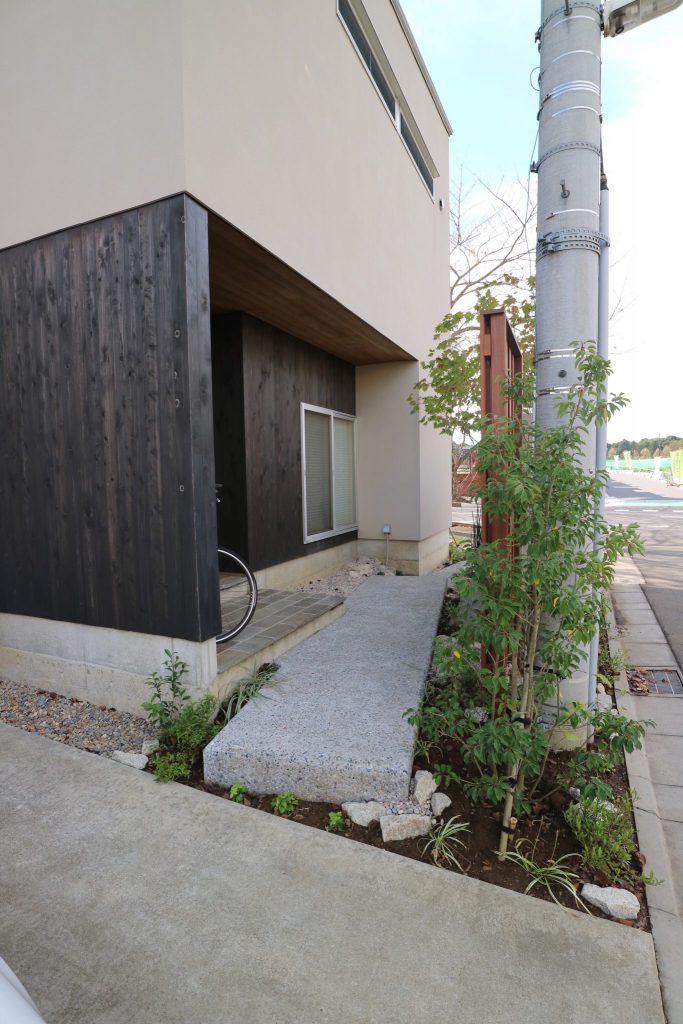 門構えとアプローチがメインになるご依頼でしたが、電柱と支線をどう処理するかが一番の課題となりました。思い切って玄関正面に対する動線を無くして考え、露地の雰囲気を持つアプローチとしました。