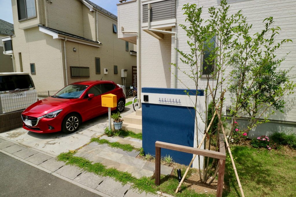 グレーとベージュで構成された建物外観に、印象的なネイビーブルーの壁とイエローのポストで少しポップな北欧テイストを加えてみました。初めは表札だけをブルーにする内容で打ち合わせを進めていましたが、最後の最後の打ち合わせ時に「もうちょっと攻めちゃいますか!?」と言う話から壁にもブルーをご採用いただき、結果的にとてもいい感じになりました!笑