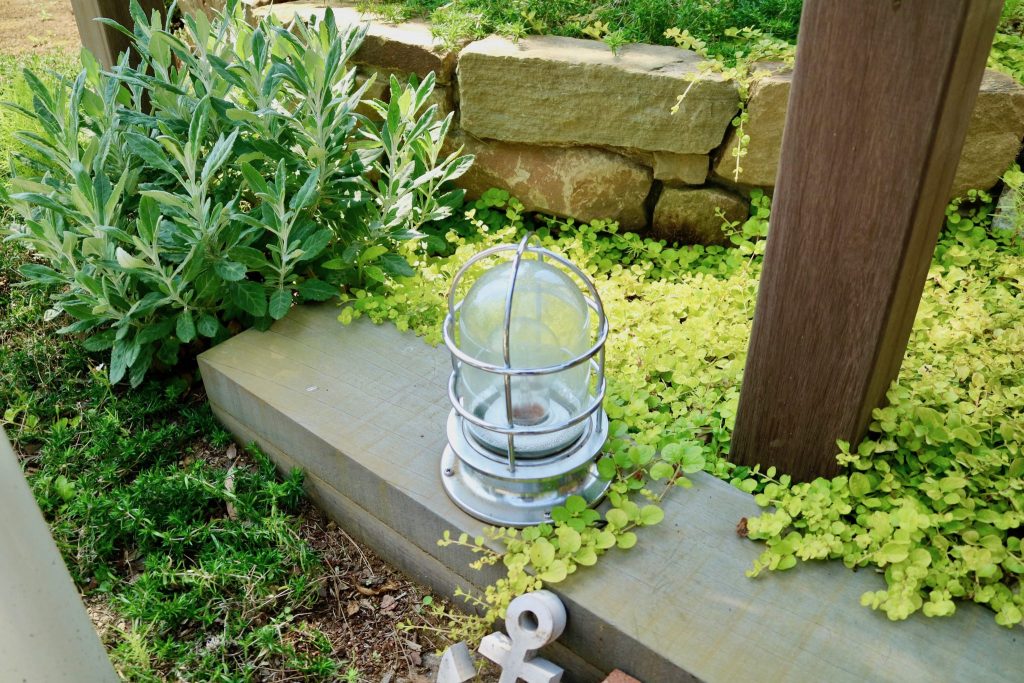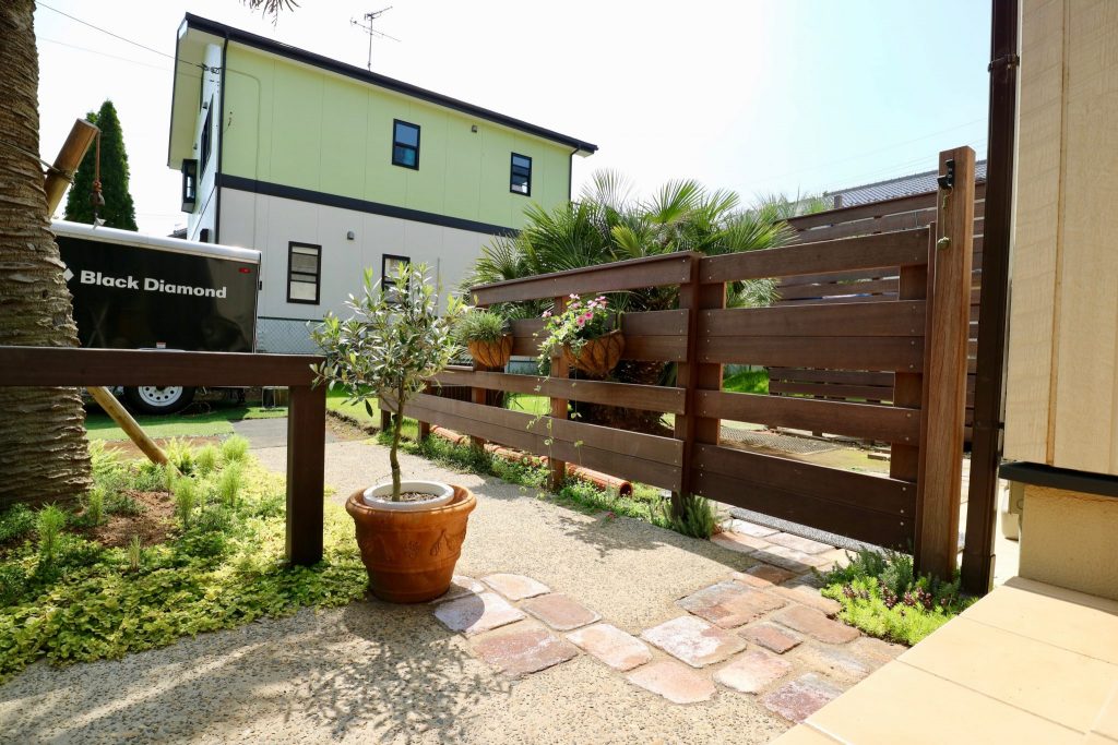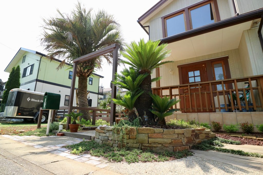 一口に「ハワイ」と言っても色々ありますので、素材感やイメージのお話を沢山させていただきまして、大きなヤシの木と広い芝生の似合う石積みと古レンガ、枕木やウッドゲートをご採用頂きました。