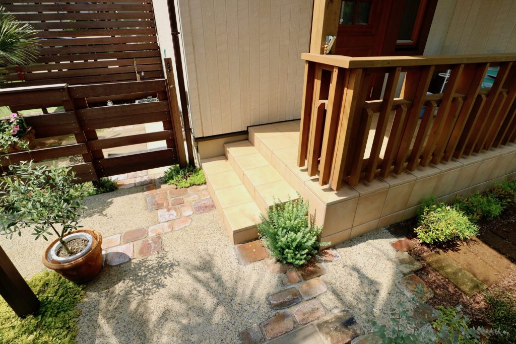 ヤシの木に添えた石積みと古レンガのアプローチでナチュラルハワイアンな印象に仕上げてみました。