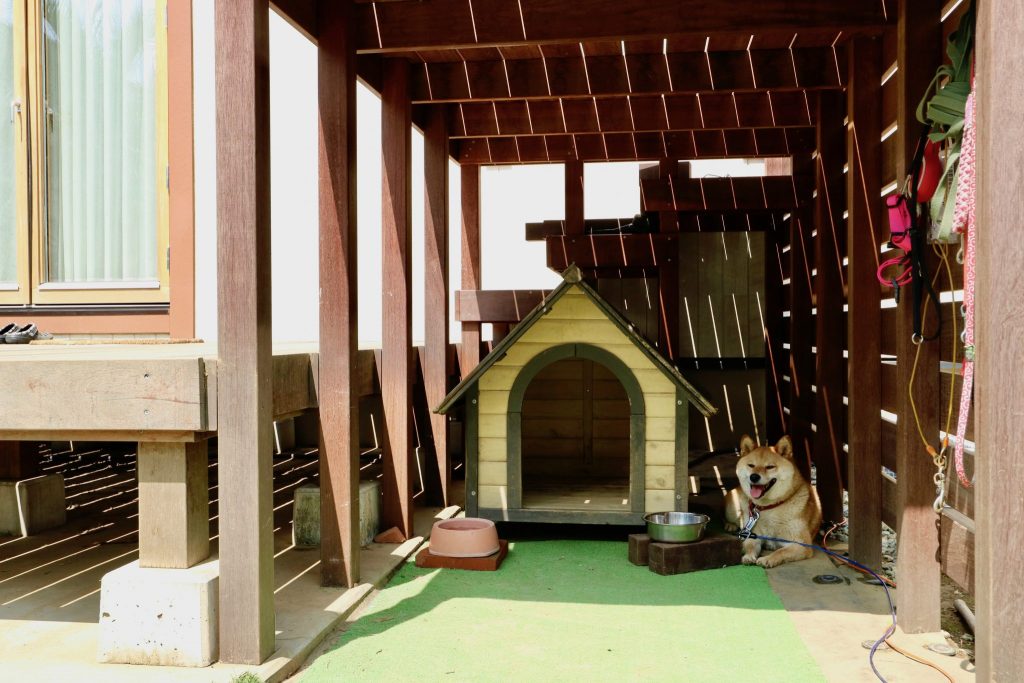 また、もう一つのご要望でありました「ワンちゃんが日差しや雨風をしのげる様に・・・何か欲しい」については、既存のウッドデッキと合体させた形でハイデッキをデザインし、床下をワンちゃんのスペースにしてみました。