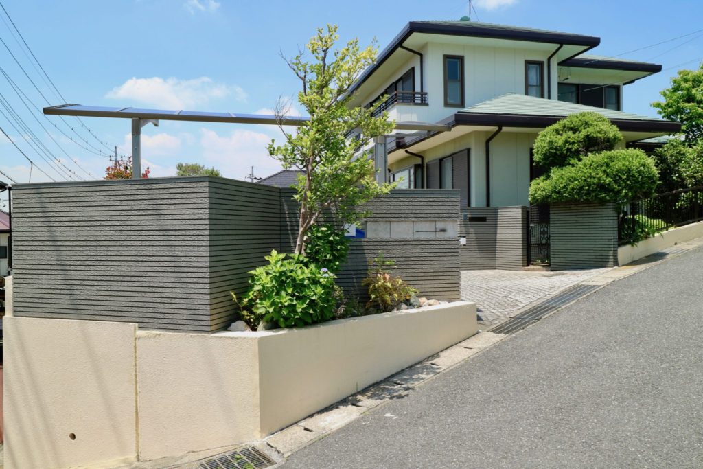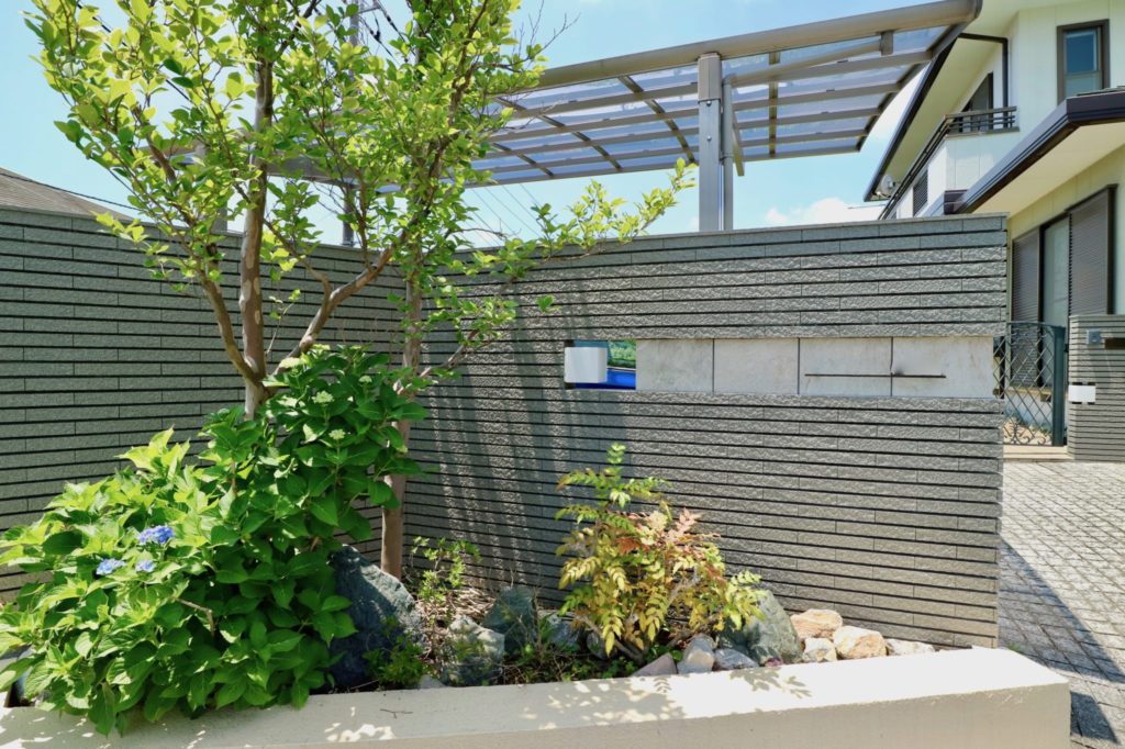 道路ぎわの植栽には既存物に数株を加えて少しボリュームアップをしました。アクセントで置いたごろた石が思いのほか効いて素敵なエクステリアに生まれ変わりました。