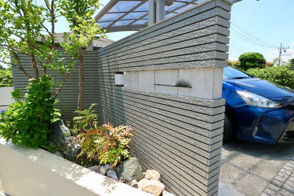 もともと門扉の袖壁の一方にインターホン、表札、照明が集中しておりましたが、今回は表札を道路ぎわの壁に移して全体的なゆとり感を作り出してみました。この壁は解体復旧するにあたってクランクの折り方を若干変えてあり、以前は鋭角だった箇所を直角にすべく道路に対して開いた状態のデザインにする事で開放的でゆとりのある印象がファサードに生み出せたと思います。