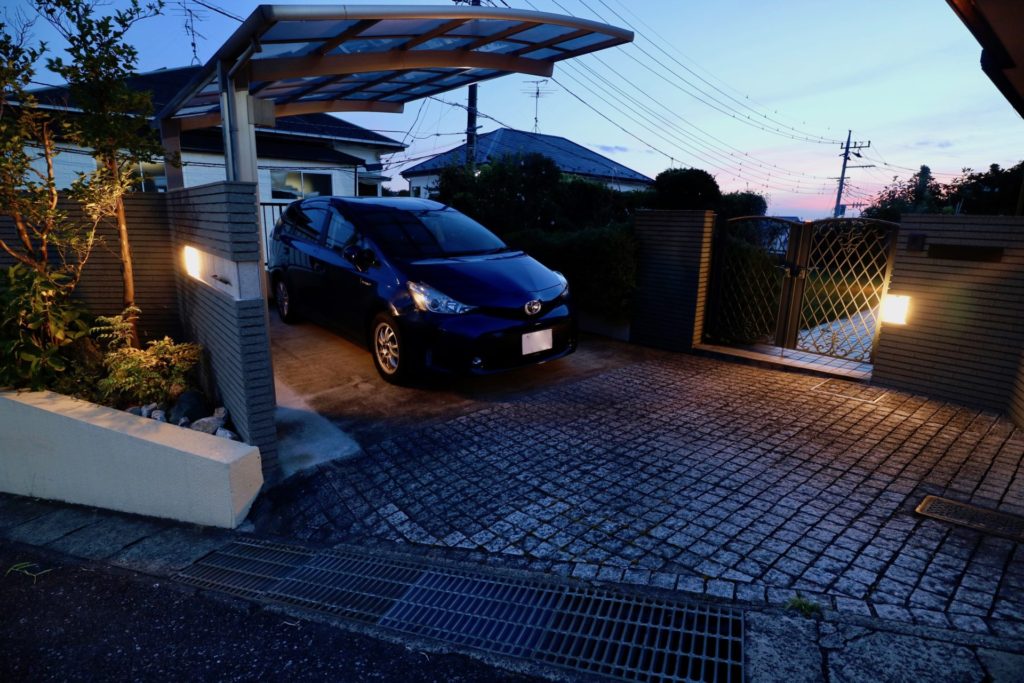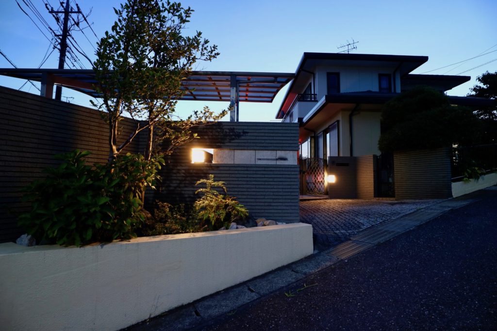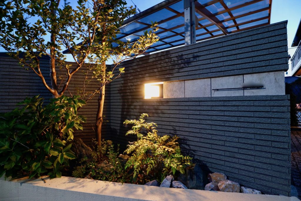 表札を取り付ける箇所はタイルを変えてデザイン性を持たせてあり、照明も外側と内側の両方向への配光が可能な位置付けで増設しました。