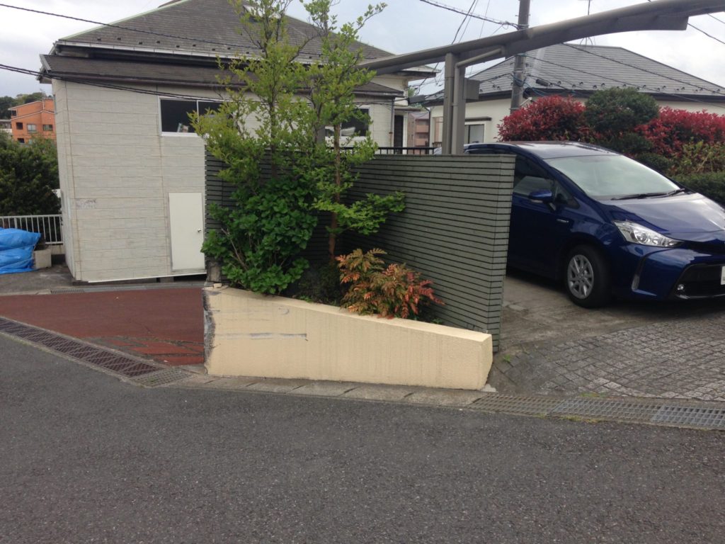 道路ぎわのフェンスも車をぶつけられた様で所々に破損が見受けられ、もともとの柱の取付け方も何故か統一感が無い状態でしたので、その部分も合わせて新品に交換復旧させました。
