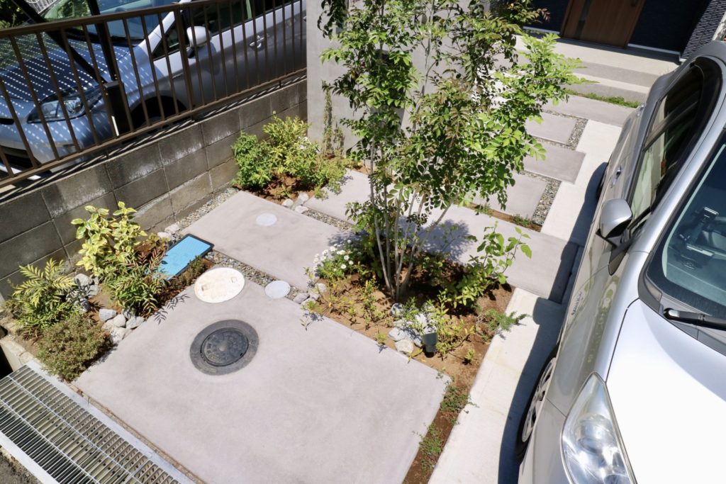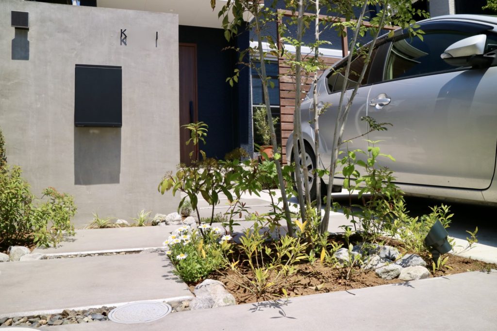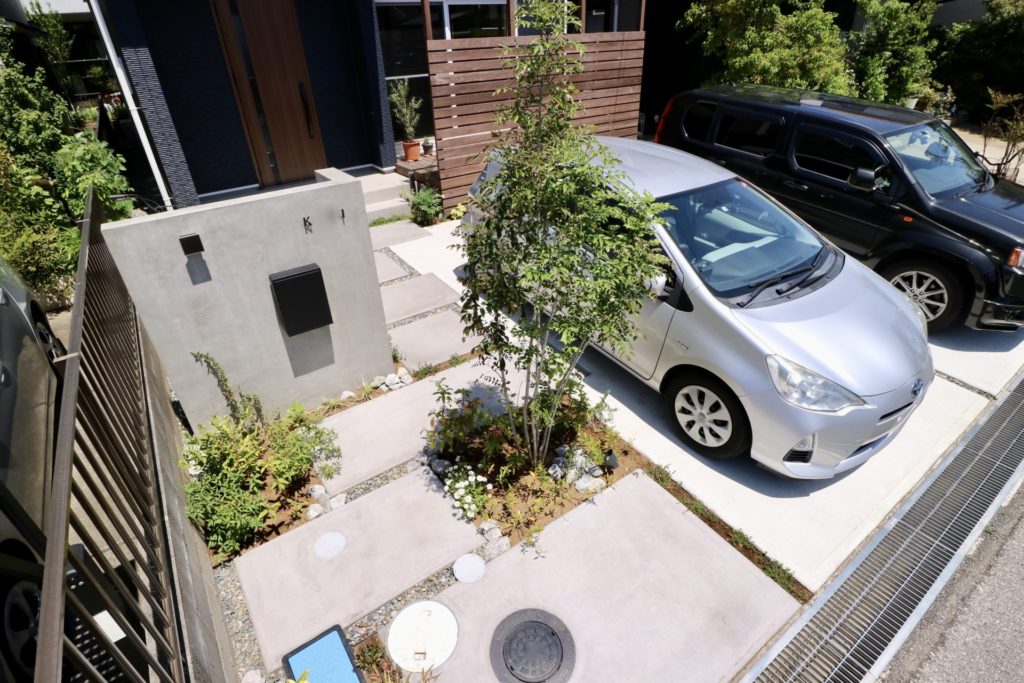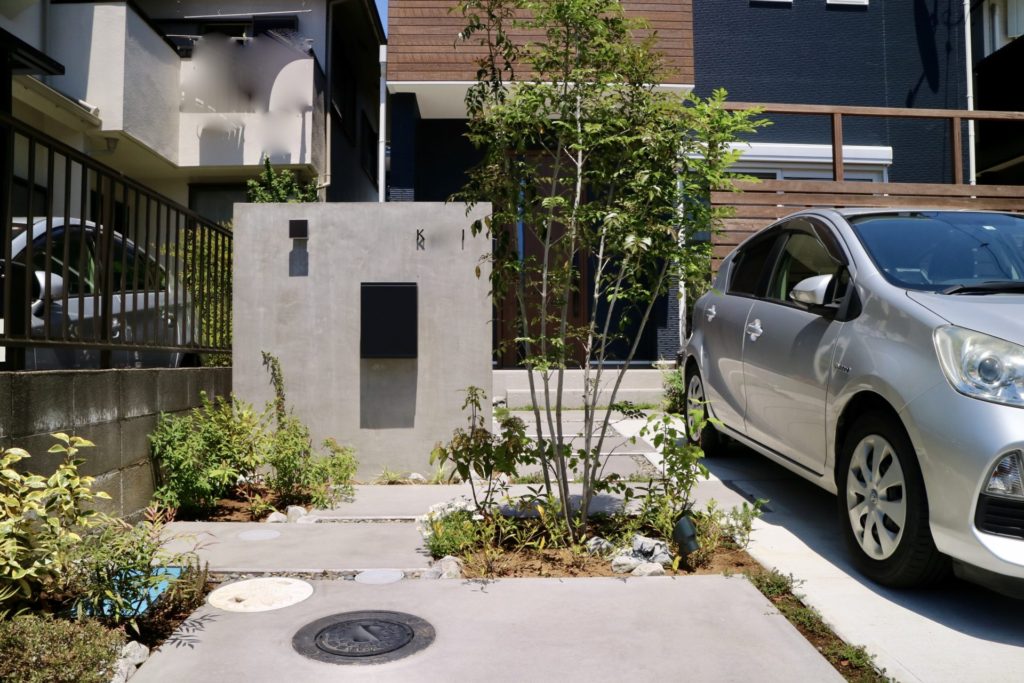 無骨なグレーのグラデーションが植栽の緑と引き立て合うクールなシンプルモダン