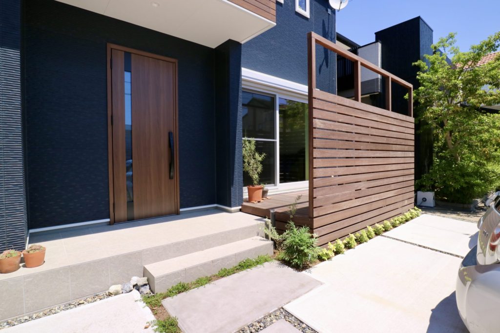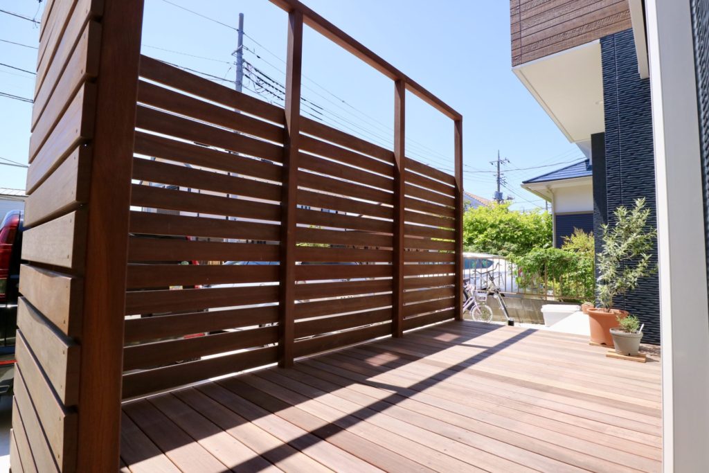 大きな掃き出し窓の前にはお部屋の広がりを感じて頂くためのウッドデッキと、道路からのダイレクトな視線を遮るための程よい目隠しのウッドフェンスを設置しました。上部には日除けのシェード布を固定できる様に高い位置に梁をかけて金具を設置してありますので、日差しの強い季節にはお部屋を涼しく保つのに一役買ってくれる事でしょう。