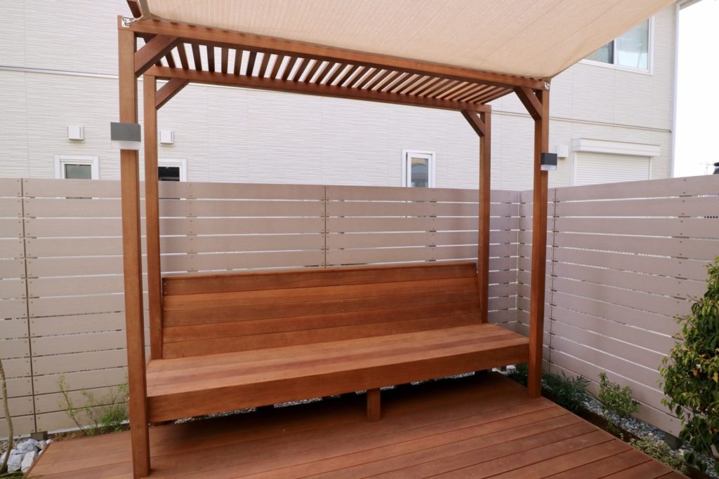 奥さまがご希望された「ベンチ」も、座面の深さや背もたれの角度にこだわり、最高の座り心地を生み出しました。一体化させたパーゴラに日除けのシェードも設置していますので日差しの強い日でも家族みんなが心地よく過ごせるお庭になったと思います。