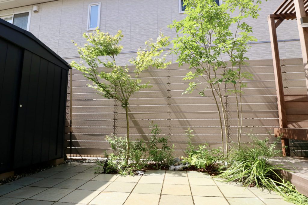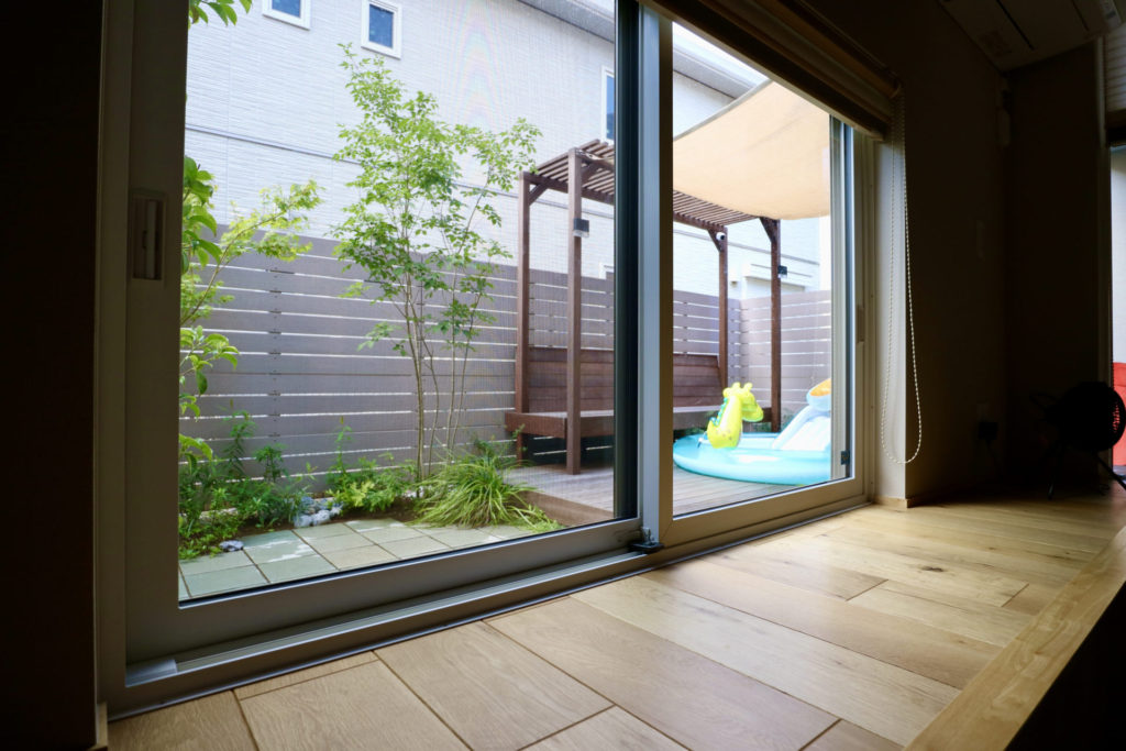 お部屋とお庭を繋ぐ掃き出し窓の配置が少し変わっていましたので、建築時の窓の配置の意図やお庭に求める機能を伺い、そこからどの様にお庭が使えるのかをご提案させていただきました。