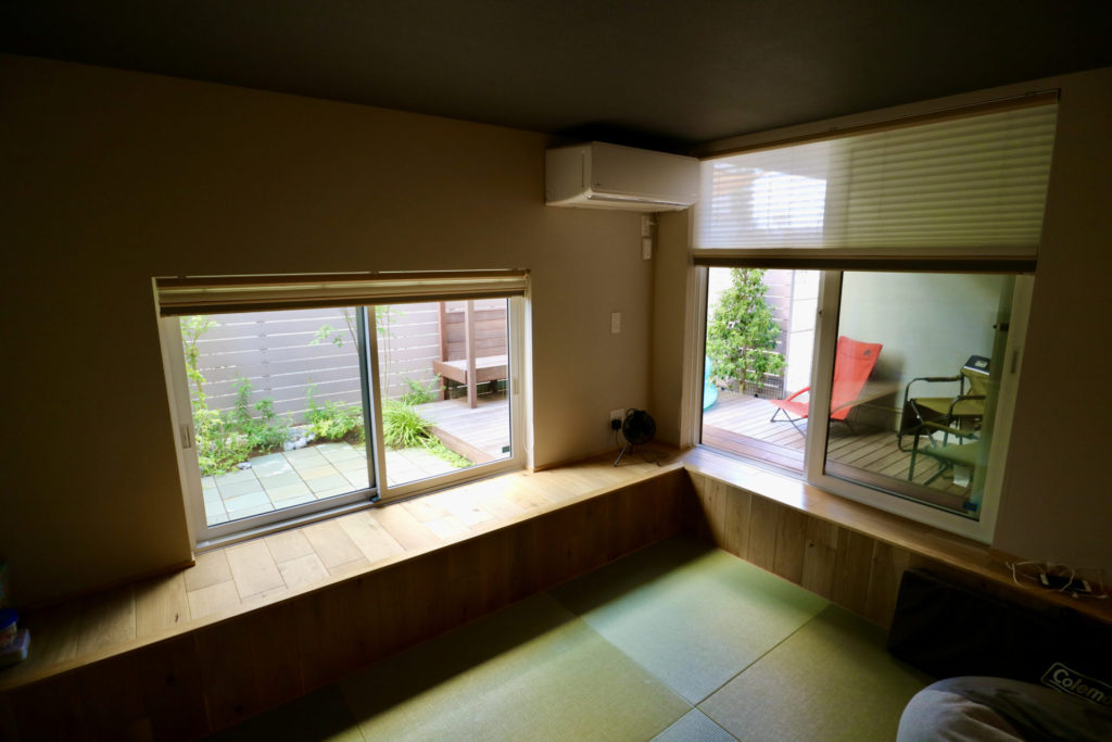 多目的スペースの確保については、掃き出し窓から繋がる床をローデッキとして作りました。そもそもが部屋の床レベルにある掃き出し窓とは異なっておりましたので、無理にサッシ下にデッキ床を持ち上げず、むしろ庭部分との繋がりを重要視して低い床の造作としました。元々出入りに使われていたステップも再利用してちょうど良い使い勝手にできたと思います。