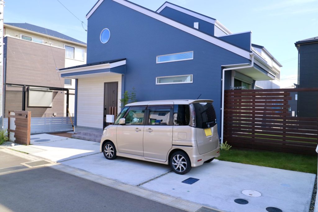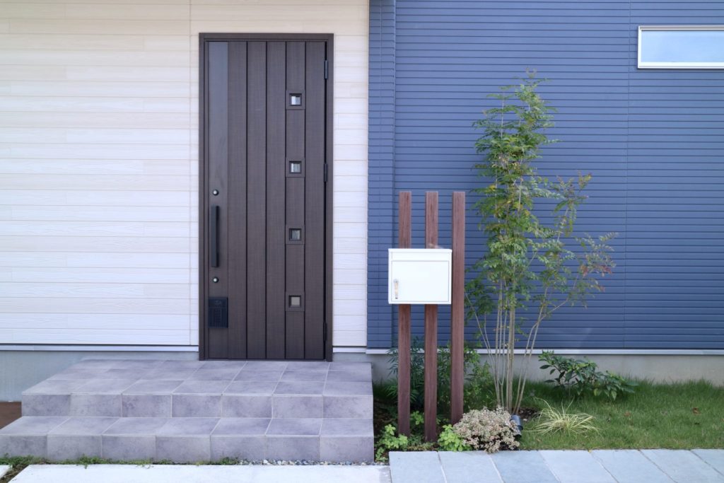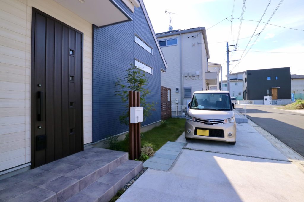 門柱とポストを前後に配置する事で駐車場スペースと駐輪場スペースの確保をしながらファサードにゆとりのある懐を作る事を意識しました。アプローチとしての化粧舗装はしていませんが、それぞれの足元にネイビーカラーの建物外壁に合わせたブルーの敷石をアクセントで配置する事で、それぞれの存在感がより際立っていると思います。