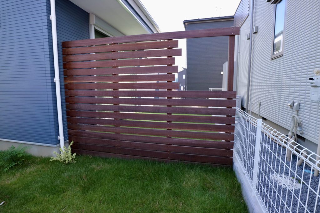 木製門柱のランダムなラインを反対側に見えるお庭のウッドフェンスにも取り入れて、両サイドをリンクさせ全体の一体感を感じられる様に考えました。