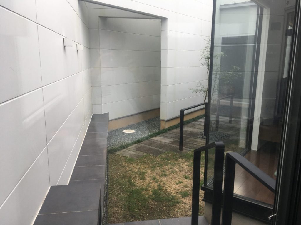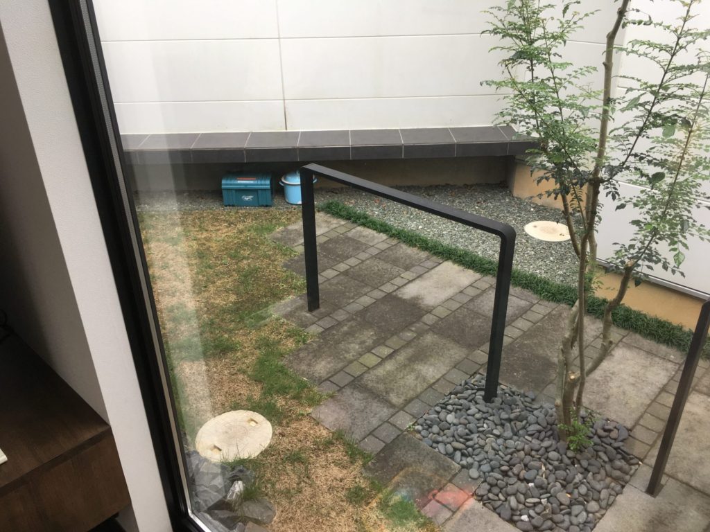 黒い手すりは全体のデザインを妨げる事なく機能としても必要という事でしたのでそのまま残しましたが、植栽は今後の枝の伸び方も考慮してシマトネリコからアオダモに入れ替えて一新を図りました。
